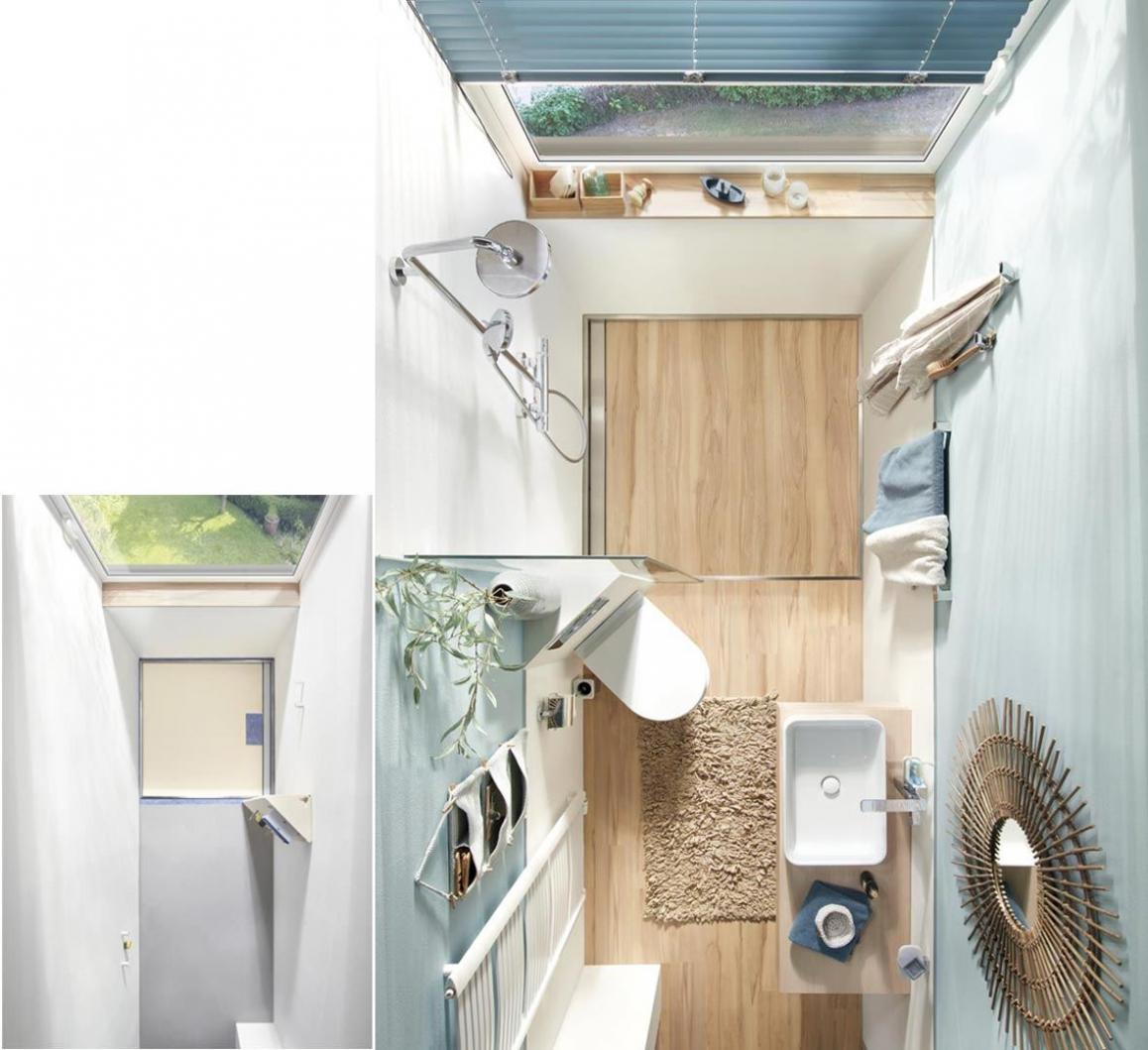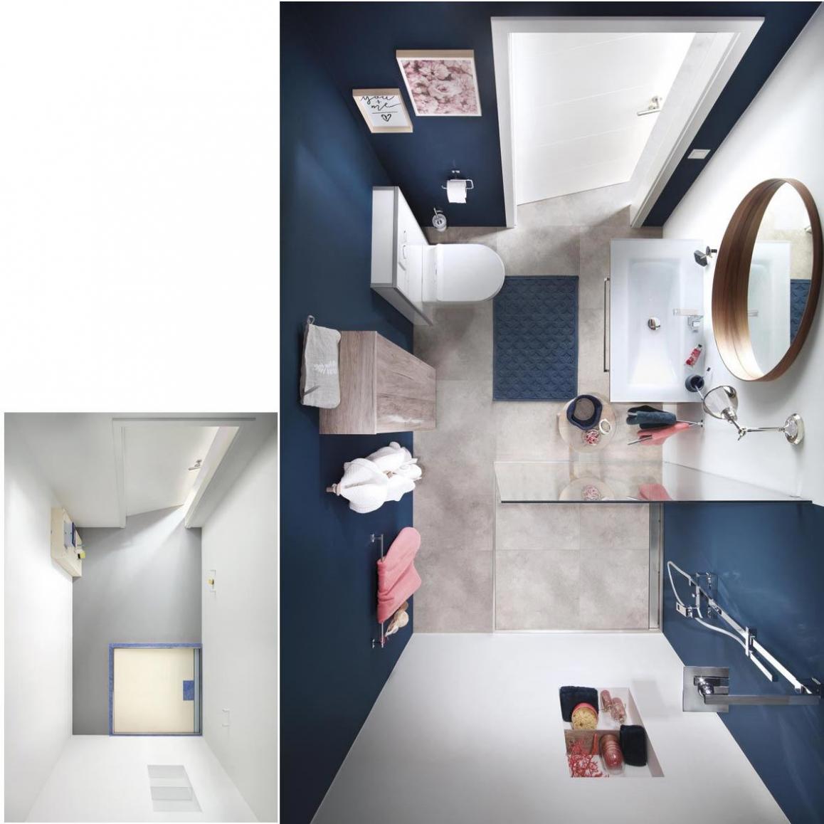 Dieser Vergleich von drei Möglichkeiten, ein nur 90 cm breites Schlauchbad einzurichten, zeigt, dass durch die geschickte Auswahl der Installationselemente Platz gespart werden kann.