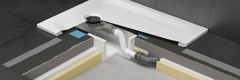 Erreicht wird das unter anderem durch Vorfertigung, was im Bad, einem der technisch vielfältigsten Gewerke auf dem Bau, noch viel zu selten genutzt wird. Die Installationsbox ist eine Plug-and-Play-Lösung für den sicheren Anschluss von Duschwannen (oder Badewannen). Alle notwendigen Bauteile des Ablaufs sind ab Werk vorkonfektioniert und müssen nur noch mit der Abwasserleitung verbunden werden. Anschließend wird die wasserdichte Box direkt in den Bodenaufbau eingearbeitet und normkonform in die Verbundabdichtung integriert. Eine zusätzliche Abdichtung mit Dichtband ist nicht mehr notwendig. Die Duschwanne selbst wurde mit dem „Minimum Wannenträger“ vorkonfektioniert und dann auf den Estrich aufgeklebt, eine praxisnahe und zudem schalldämmende Lösung.