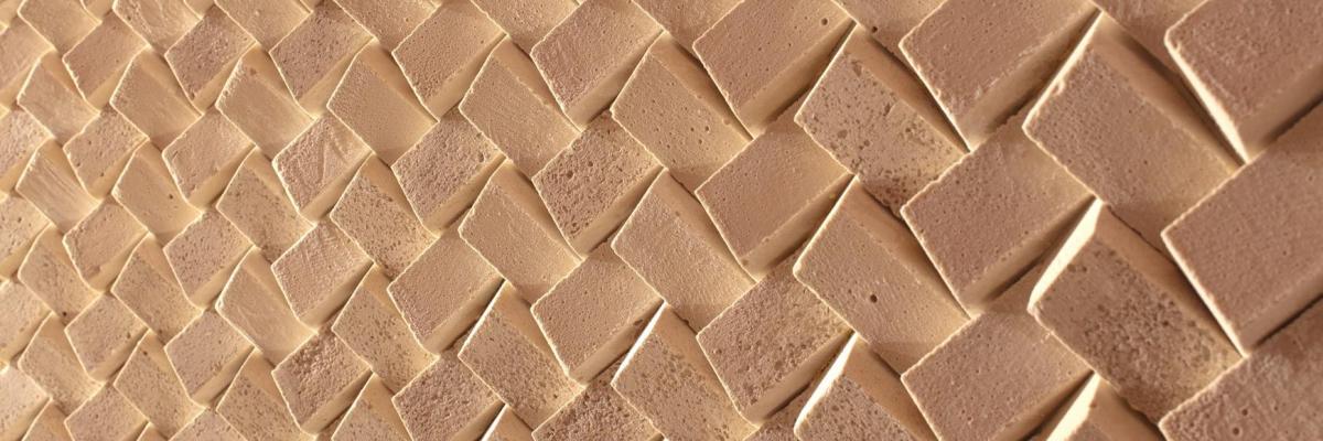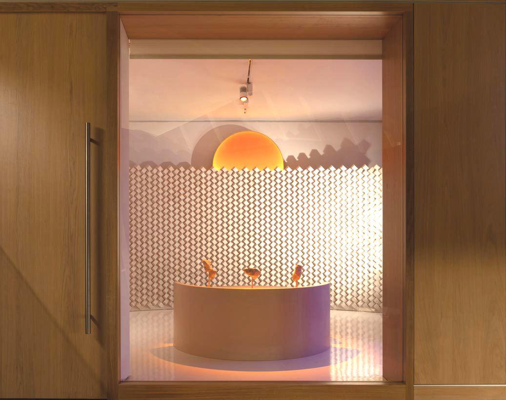 Die drei Meter lange, leicht gebogene Wand besteht aus 1 300 Stück Salzfliesen. Natürlich hat die Architektin Forés auch ein wenig Gips und Bindemittel zugesetzt, um eine höhere Stabilität zu erzielen. Aber im Wesentlichen sind es Salzfliesen aus der chilenischen Atacamawüste. Und zwar ist es das Salz, das beim Transport verloren geht oder als Abfall der Lithiumproduktion liegen bleibt. Zwei leicht unterschiedliche Oberflächen und eine exakt geometrische Anordnung erzeugen eine so genannte reaktive Wandfläche. Die Stücke wurden in Silikonformen gegossen und anschließend leicht gesandet. Eine zusätzliche Lichtinstallation scheint die Wand zum Leben zu erwecken.