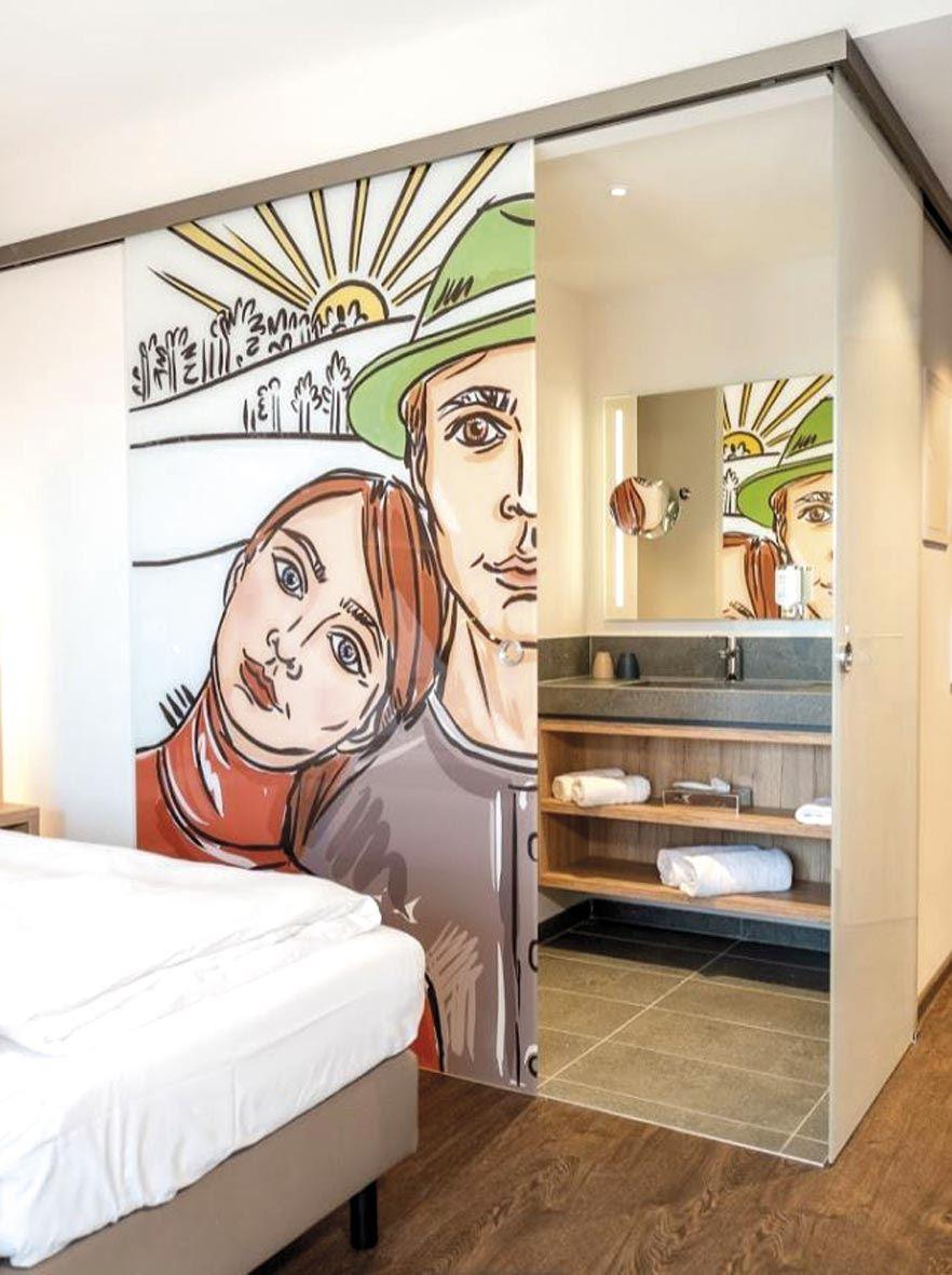 Die Intention des Architekturbüros bestand darin, die Badezimmer mit einer gewissen Variabilität in die Gästezimmer zu integrieren und nur durch die verschiebbare, künstlerisch gestaltete Glaswand zu trennen. „Wir wollten den Zimmern Großzügigkeit verleihen und die Ecke, in der sonst das Badezimmer ‚verschwindet‘, gestalterisch auflösen“, erklärt Büro-Inhaber Manfred Stockinger. Den Gästen bleibt es dabei überlassen, ob sie die Glastrennwand diskret schließen und die Neureuthers Kunst genießen oder doch lieber großzügig geöffnet lassen.