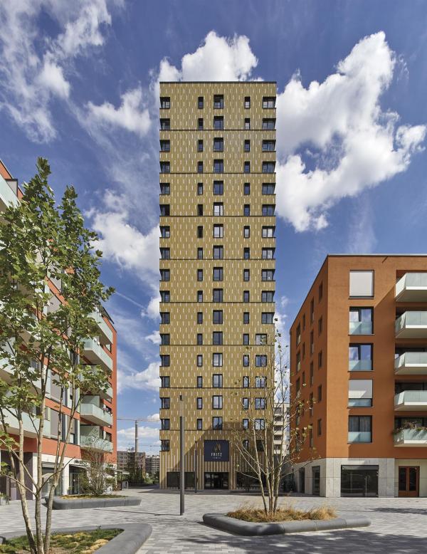 Das neue Quartier „Lehrter Straße“ liegt nur wenige hundert Meter nördlich des Berliner Hauptbahnhofs. Es entstand in den letzten sieben Jahren auf Grundlage eines städtebaulichen Masterplans des Architekturbüros Sauerbruch Hutton und hat eine einstige Brache in ein vitales Wohnquartier mit rund 1 000 Miet- und Eigentumswohnungen verwandelt. Die Architekten entwickelten eine Baustruktur aus sechs- und achtgeschossigen Einzelgebäuden, die sich entlang einer Bahnlinie zickzackförmig aneinanderreihen. Situiert am Quartiersplatz mit Läden und Lokalen, markiert der „Fritz Tower“ weithin sichtbar die geografische und gemeinschaftliche Mitte des neuen Viertels. Das Wohnhochhaus mit teils acht und teils 18 Geschossen beherbergt insgesamt 266 zwischen 21 und 47 m² große Mikroapartments. Darüber hinaus bietet das Haus zahlreiche Annehmlichkeiten wie zum Beispiel einen Concierge-Service, einen Coworking Space, ein hauseigenes Fitnessstudio und ein öffentliches Bistro.