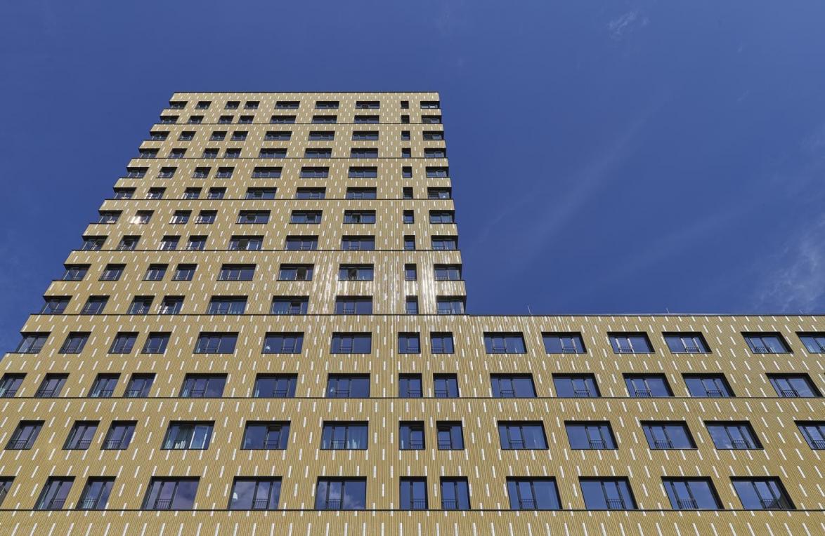 Die Architekten entschieden sich vor allem aus drei Gründen bereits zu Beginn der Entwurfsphase für eine glasierte Keramikfassade. „Zum einen ist das Material robust, widerstandsfähig und pflegeleicht, dies ist gerade im Hochhausbau von Bedeutung, weil es die Zahl der meist nur unter erschwerten Bedingungen durchführbaren Wartungs- und Reinigungsarbeiten minimiert“, sagt die projektleitende Architektin Vera Hartmann. „Zum anderen ist Keramik ein natürliches Material, das im Wesentlichen aus Ton besteht und mit seinen haptischen Oberflächenqualitäten eine wohnliche Wärme vermittelt.“ Letzteres gilt insbesondere für die Riemchen, deren glänzende Glasur Tiefe und handwerkliche Herstellungsprozesse widerspiegelt. Der dritte Grund für die als Spitzprofile ausgebildeten Keramikriemchen liegt im vergleichsweise kostengünstigen Fassadenaufbau: Die dünnen und leicht gewichtigen Elemente bilden den keramischen „Oberbelag“ eines Wärmedämmverbundsystems, das die aktuellen energetische Anforderungen erfüllt.