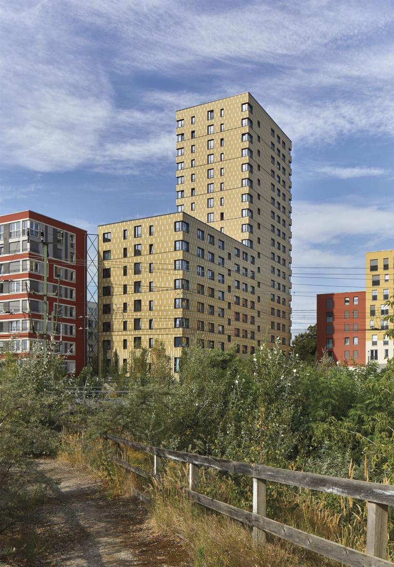Das neue Quartier „Lehrter Straße“ liegt nur wenige hundert Meter nördlich des Berliner Hauptbahnhofs. Es entstand in den letzten sieben Jahren auf Grundlage eines städtebaulichen Masterplans des Architekturbüros Sauerbruch Hutton und hat eine einstige Brache in ein vitales Wohnquartier mit rund 1 000 Miet- und Eigentumswohnungen verwandelt. Die Architekten entwickelten eine Baustruktur aus sechs- und achtgeschossigen Einzelgebäuden, die sich entlang einer Bahnlinie zickzackförmig aneinanderreihen. Situiert am Quartiersplatz mit Läden und Lokalen, markiert der „Fritz Tower“ weithin sichtbar die geografische und gemeinschaftliche Mitte des neuen Viertels. Das Wohnhochhaus mit teils acht und teils 18 Geschossen beherbergt insgesamt 266 zwischen 21 und 47 m² große Mikroapartments. Darüber hinaus bietet das Haus zahlreiche Annehmlichkeiten wie zum Beispiel einen Concierge-Service, einen Coworking Space, ein hauseigenes Fitnessstudio und ein öffentliches Bistro.