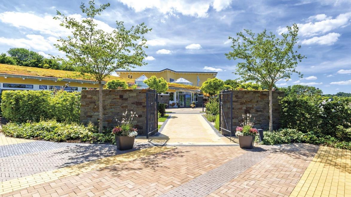 Die heitere Atmosphäre, die das Kinder- und Jugendhospiz Balthasar im sauerländischen Olpe umfängt, wird schon auf dem Parkplatz spürbar. Die Fläche aus farbenfrohen Pflasterklinkern liegt wie ein bunt gestreifter Teppich vor den Besuchern und signalisiert: Hier darf man auch lachen und fröhlich sein. Die Neugestaltung der Außenanlagen ist unkonventionell und wird genau deshalb dem Geist dieses besonderen Ortes gerecht.
