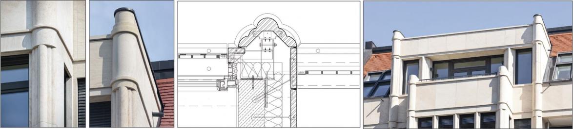 Das besondere Merkmal der Hauptfassade sind die Naturstein- bzw- Steinmetzarbeiten. Ca. 800 Werkstücken hat die Stuttgarter Lauster Steinbau GmbH dafür gefertigt. Sie sind teils plattiert, teils Massivlisenen, das Gesamtgewicht des Steinmaterials beträgt 50 Tonnen. Die größten und schwersten Werkstücke sind die profilierten Lisenen, bei einer Abmessung von bis zu ca. 160 x 40 x 20 cm und einem Gewicht von ca. 250 kg. Eine Besonderheit ist die Art der Verankerung dieser Massivteile mit einer Edelstahl-Aluminium-Unterkonstruktion, die von Decke zu Decke spannt, bzw. Spezialkonsolen. Alles wurde objektbezogen geplant. Besonders reizvoll für die Steinmetze war die Aufgabe, die Profilierungen der Lisenen und die Kannelierungen der Wandplatten herzustellen. Eingesetzt wurde Waldenbucher Sandstein, Stubensandstein, Subarkose der Löwensteinformation des mittleren Keupers. Das Material hat als Hauptgemengeanteil Quarz. Daraus resultiert die gute Haltbarkeit und Widerstandsfähigkeit dieses Sandsteins.