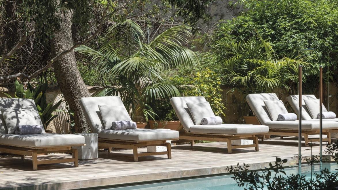 Der begrünte Innenhof verzaubert mit einem von alten Bäumen und komfortablen Relax-Liegen umgebenen Pool