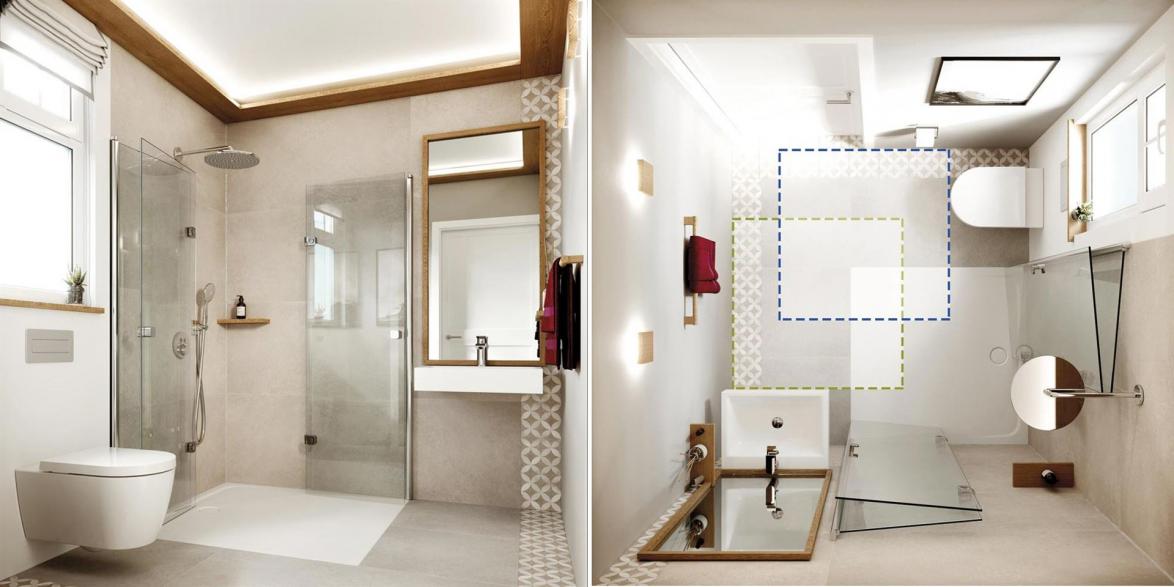 Bei der Umsetzung eines barrierefreien Badezimmers müssen nach DIN 18040-2 vor jedem Sanitärgegenstand Bewegungsflächen von mindestens 120 x 120 Zentimetern eingehalten werden, die sich allerdings überschneiden dürfen. Das führt in einem Minibad von beispielsweise 4 Quadratmetern unweigerlich zu Konflikten. Sorgenkind ist in fast allen Fällen die Dusche. Denn selbst, wenn sie bodengleich ausgeführt wird, kann sie nicht einfach als Bewegungsfläche eingerechnet werden.