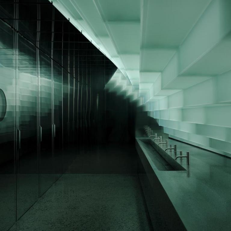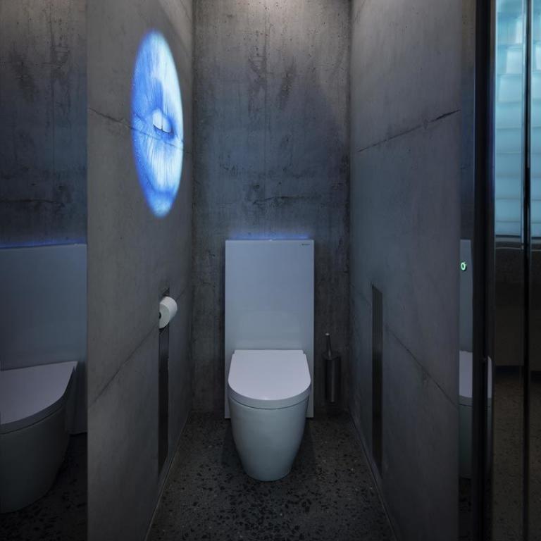 Wichtig aber ist für die über die Brücke wandelnden Besucher, dass es von hier aus zu den Toiletten im unteren Stockwerk geht. Ihnen widmete der Hausherr Christen Sveaas besondere Aufmerksamkeit. Deshalb ließ er hier von dem Künstler Tony Oursler Videos mit Voyeuren an den Wänden anordnen. Zudem wird hier die Idee verdrehter Optik konsequent weitergeführt. Die ikonischen Stand-WCs des Designers Philippe Starck wirken in diesem außergewöhnlichen Ambiente wie museale Exponate.