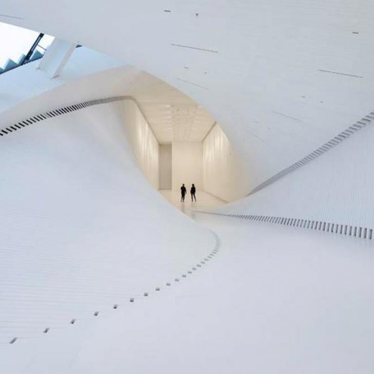Und das ist denn auch die wichtigste DNA von „The Twist“, der wie ein futuristischer, nahe der Mitte um 90 Grad gedrehter Balken wirkt. Gebaut ist die Brücke aus 40 Zentimeter breiten Aluminiumpaneelen, was wie ein aufgefächerter Bücherstapel wirkt. Ein ähnliches Prinzip bestimmt auch das Innere mit weiß gestrichenem Tannenholz als Verkleidung für Boden, Wände und Decken. Durch diese aseptischen Tunnel wandelt der Besucher, ohne großartig von den platzierten Kunstwerken abgelenkt zu werden.