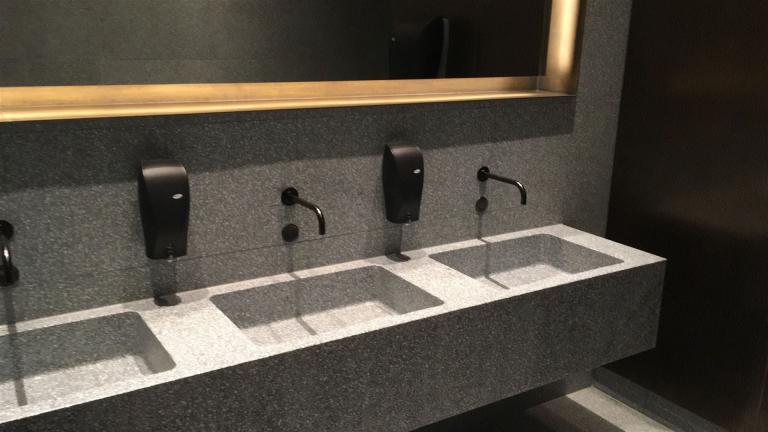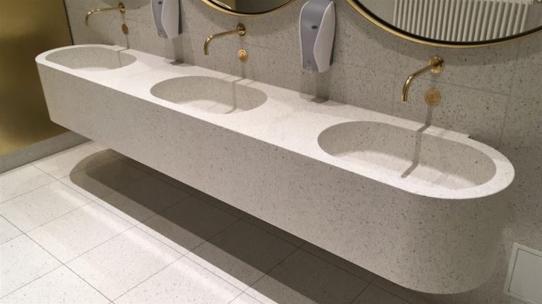 Terrazzo bestimmt auch das Bild in den Sanitäranlagen im Erdgeschoss: für die Damen in heller, fast weißer Ausführung mit dunklem Zuschlag, für die Herren in einem mittleren Grauton mit hellen Steinen. Ein besonderer Hingucker: die circa 400 Kilo schweren aus einem massiven Block gefrästen Dreier-Waschtische.