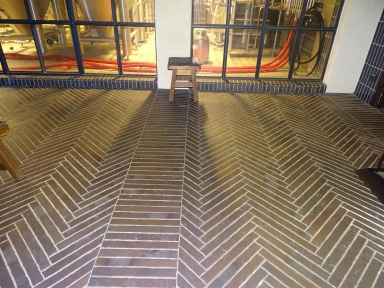 Im Keller setzt sich das Reich des Bierbrauers mit den Gär- und Lagertanks fort. Abgetrennt durch eine Glasforint kann hier in rustikaler Atmosphäre mit Blickkontakt zu den Edelstahltanks und der Brauanlage getrunken und gegessen werden. Der urige Braukeller ist mit langen Bänken und Tischen möbliert. Am Boden sind flächig wieder Klinkerriemchen verlegt, diesmal im Fischgrätverband. Auf der anderen Seite der Glasfront, im Feuchtbereich des einsehbaren Arbeitsbereichs, wurden die Boden- und Wandflächen entsprechend der damals noch gültigen Einstufung Feuchtigkeitsbeanspruchungsklasse C (hoch-, nass- und chemisch beansprucht) abgedichtet.
